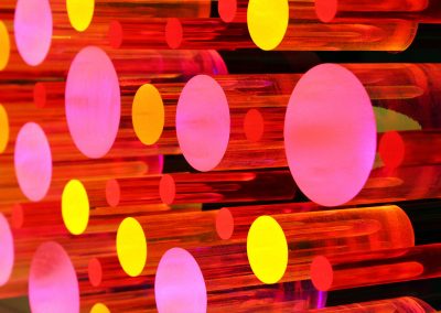 Christine Romanell’s colorful wall sculptures and installations explore non-repeating patterns informed by cosmology and physics, while rooting itself in applied design similar to Islamic patterning. Her use of rotational symmetry to generate dimensional forms allude to movement and create an event horizon, a space where the infinite tessellations of universal physics can intersect with patterns, collapsing the divide between the theoretical and the real.