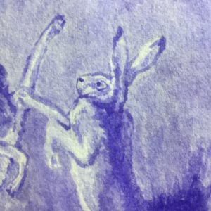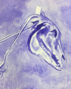 Two wild hares spar on the side of the path, also disregarding the wooden sign. From the foreground, the taxidermy framework of the famous horse Comanche looks on. Perhaps his skull is smiling in amusement at the folly playing out around him. Comanche was a horse who is purported to be the only survivor of Custer’s detachment of the U.S. 7th Cavalry at the Battle of the Little Bighorn.