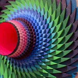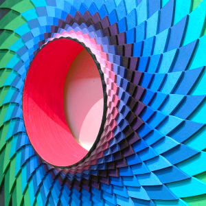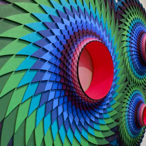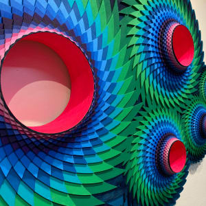 The interplay of light and shadow on the textured surface adds further dimension to this visually engaging piece. The central motif of each circular shape, a small pink circle, suggests a portal or gateway to another realm. Romanell’s skillful use of color and form creates a captivating visual experience. The bold, contrasting colors and intricate geometric patterns invite the viewer to contemplate the vastness and beauty of the universe.