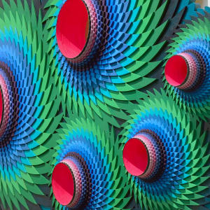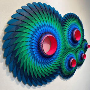 Christine Romanell’s “Cough5 Point Conjunction” is a captivating exploration of form and color. A grouping of five circular shapes, meticulously constructed from laser-cut wood and painted in a vibrant gradient of blues and greens, creates a dynamic and visually engaging composition. The intricate geometric patterns and overlapping layers suggest celestial bodies or swirling galaxies, evoking a sense of cosmic wonder.