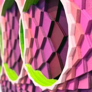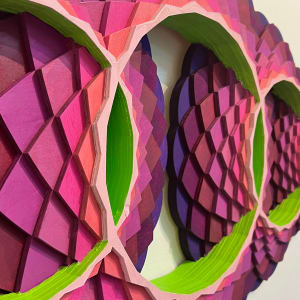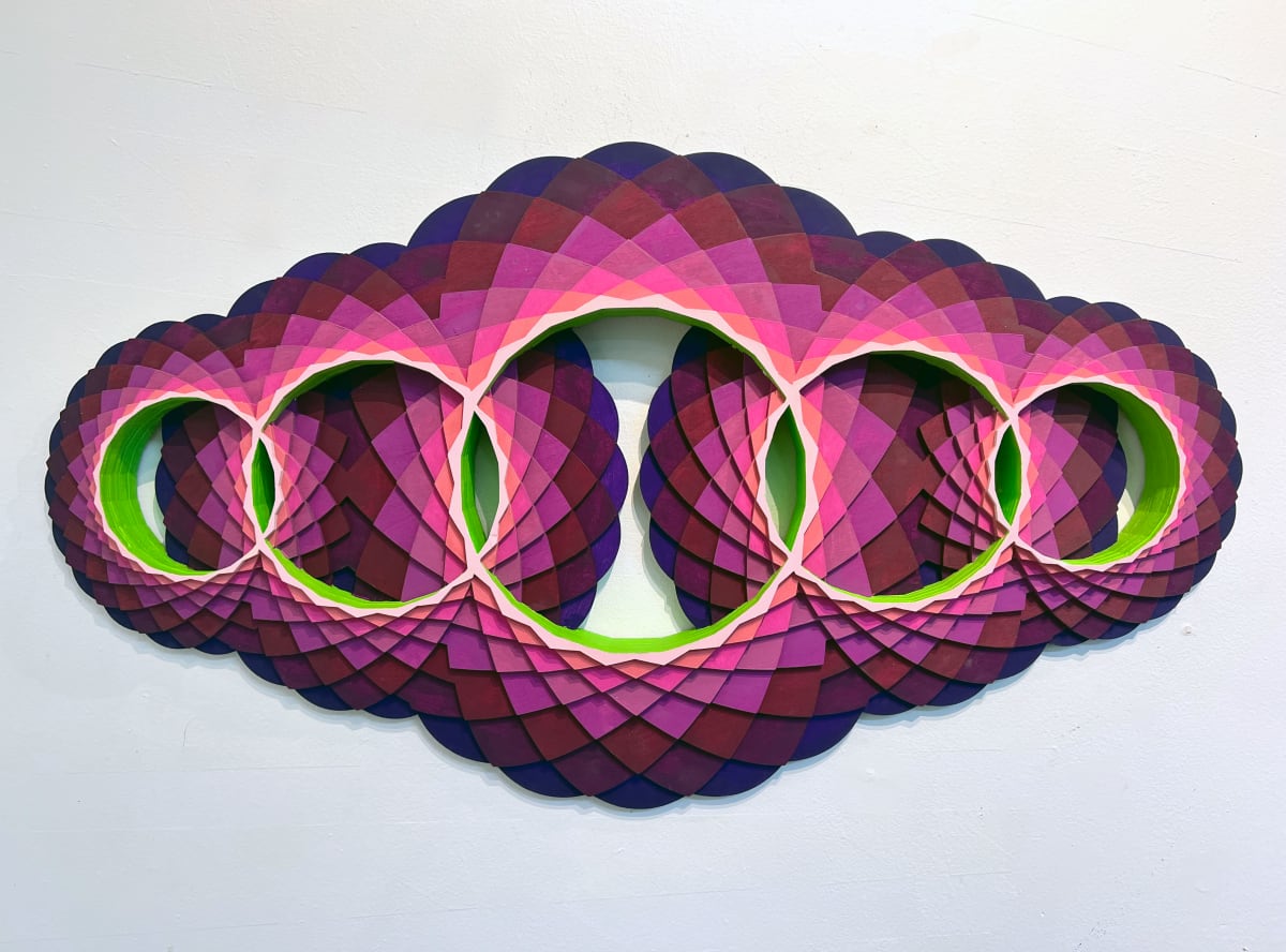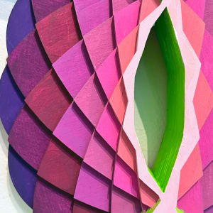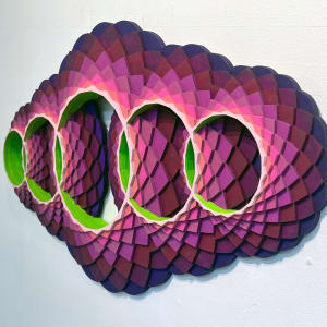 Christine Romanell’s “Crab Benula” is a captivating exploration of form and color. A complex, organic shape, meticulously constructed from laser-cut wood and painted in a vibrant gradient of purples, pinks, and greens, dominates the composition. The intricate geometric patterns and overlapping layers suggest the intricate structure of a living organism, evoking a sense of wonder and curiosity.