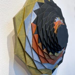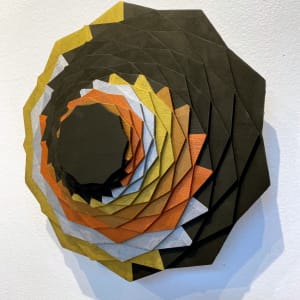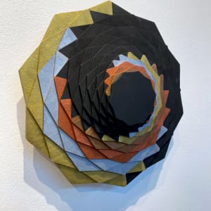 Christine Romanell’s “Gilded Spiral” is a captivating exploration of geometric form and color. The sculpture features a circular composition of overlapping, hexagonal shapes that spiral inwards towards the center. The individual shapes are painted in a muted palette of black, white, gold, and copper, creating a sense of warmth and sophistication.