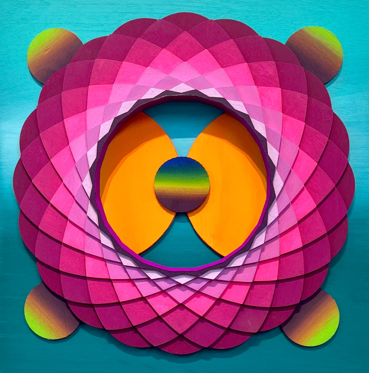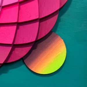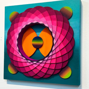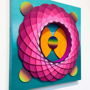 Christine Romanell’s “Moon Portal 3” is an enthralling geometric abstraction that invites viewers on a captivating visual journey. The artwork showcases a circular arrangement of meticulously layered wooden elements, painted in vibrant hues of pink, purple, and orange. These concentric layers create a powerful sense of depth and dimension.