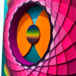 At the center, a circular aperture reveals a fascinating play of light and shadow, drawing the viewer’s focus inward. The vivid colors and intricate design suggest movement and energy, as if peering into a cosmic gateway or an unseen dimension. The piece’s three-dimensional nature amplifies its visual impact, encouraging exploration from multiple angles and perspectives.