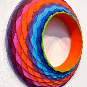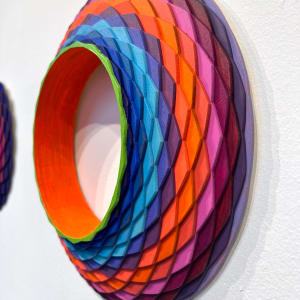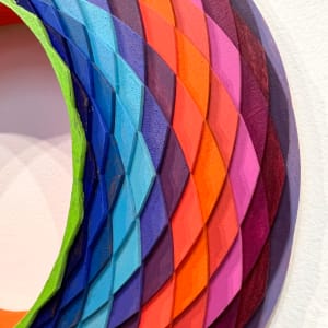 Christine Romanell’s “Orange Shifted” is a captivating exploration of color, form, and texture. The piece features a circular frame composed of overlapping, diamond-shaped segments, each painted in a vibrant shade of the rainbow. The colors are arranged in a gradient pattern, with oranges and reds dominating one side of the circle and blues and purples on the other, creating a dynamic and visually striking composition.