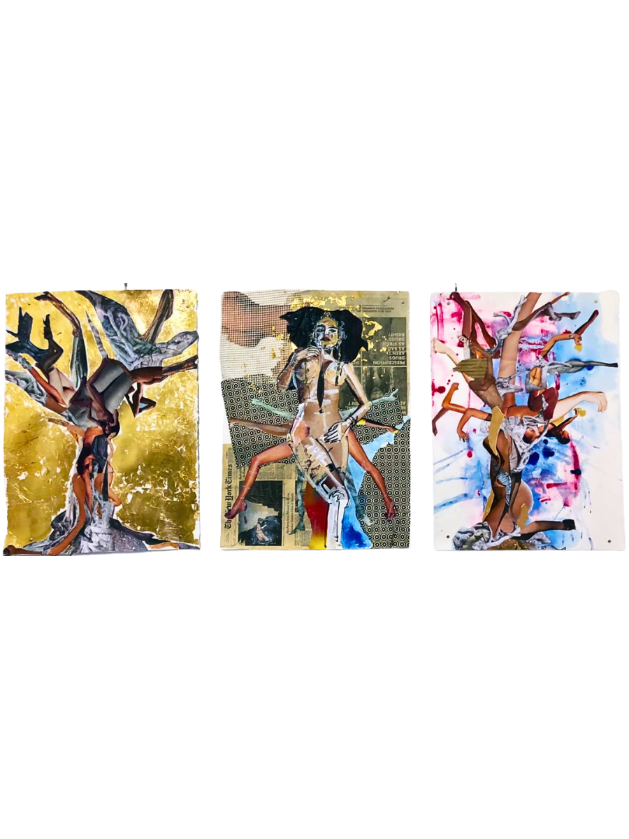 Alice’s ROOTS is a collage celebrating the resilience of women to overcome even their most difficult moments. The artist, while healing from breaking her navicular ankle bone in Miami, used pictures of the banyan tree she fell off as inspiration for this triptych which symbolizes how beauty and strength can be found within every woman – broken or whole. During recovery, Alice studied sensual images such as legs bones feet, and ankles providing solace against her injury. Her artwork thus serves not only an aesthetic function but also conveys powerful emotional depth born through adversity that transcends cultural barriers making it universally relatable and empowering all who view it!