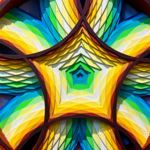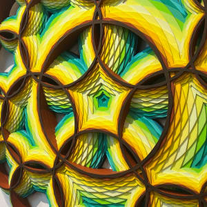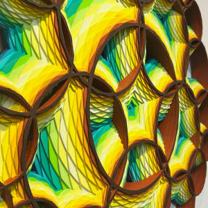 Christine Romanell’s “Yellow Hyper-Giant” is a captivating exploration of form and color. A circular mandala, meticulously constructed from laser-cut wood and painted in a vibrant gradient of yellows, greens, and blues, creates a mesmerizing sense of depth. The intricate geometric patterns and overlapping layers suggest the intricate structure of a celestial body or a cosmic phenomenon, evoking a sense of awe and wonder.
